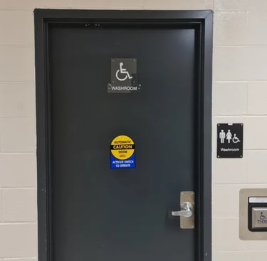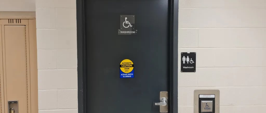 The second issue is what inspired me to write this, as it seems like a small issue and yet it has been repeated in the newly installed inclusive washroom. The doors to the inclusive washrooms are only unlocked by the automatic door button. Which, on paper, makes sense, as it is designed for those with movement disabilities. However, by making it only open by the automatic door, it keeps the door wide open for much longer than anyone who’s not openly queer to feel comfortable. When the door is opened by the automatic door, it loudly clicks and creaks open and then stays widely open for 20 seconds with no way to close it. In my experience this will consistently attract the gaze of any passerby.