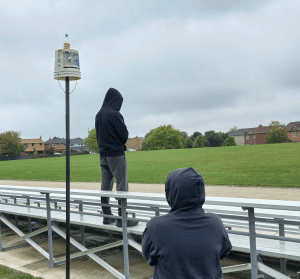 Found right next to the track's bleachers, it stood tall, at least 20 feet, atop the pole stood a vacant bucket, upside down. Atop the bucket stood a bottle of Sunny-D with enough pebbles for it to not fall from the wind.
